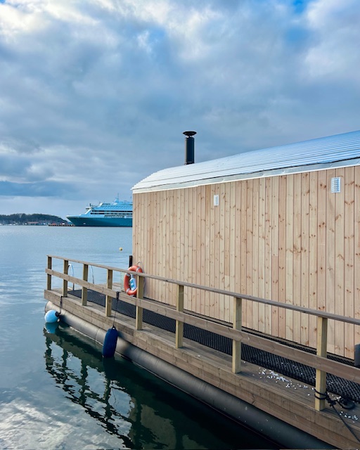 The cloakroom with lockable cabinets is located between the entrance door and the sauna room. The bathing stairs, bathing terrace and resting bench are located on Heipippa’s own pier, outside the large window.