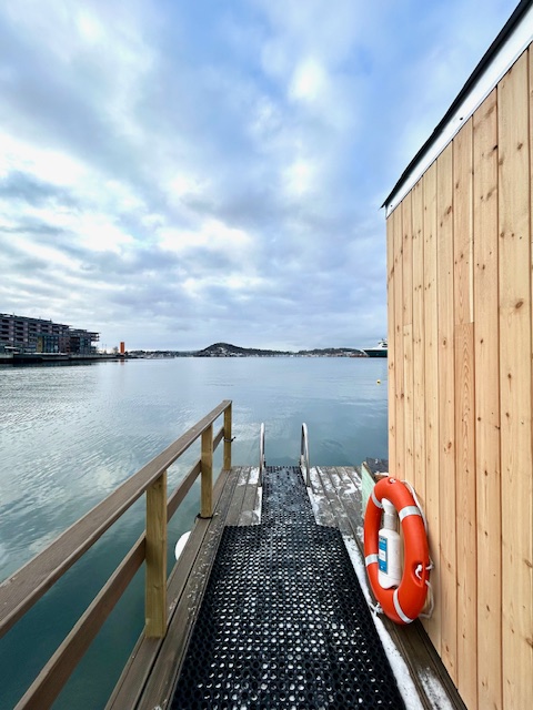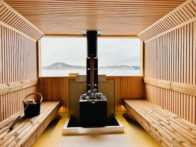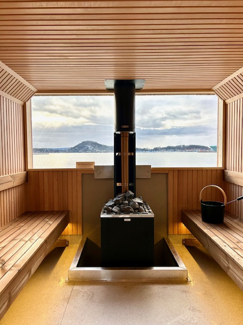 Garderoben med låsbare skap ligger mellom inngangsdøra og selve badstua. Badetrapp, badeterrasse og hvilebenk ligger på Heipipas egen brygge, utenfor det store vinduet.